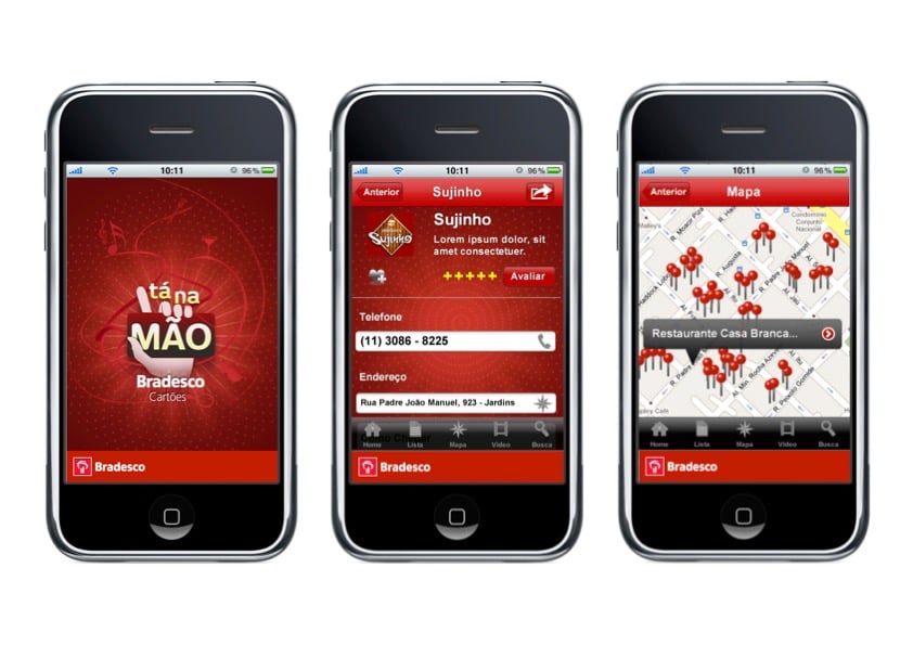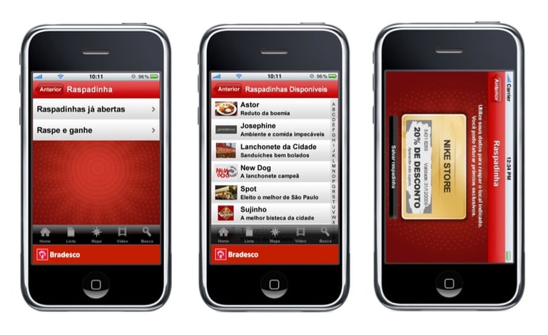 We developed an app for Bradesco Cartões that remains groundbreaking to this day. The app's goal was to encourage card use through offers and augmented reality. Augmented reality displayed partner stores on a 3D map of the surrounding area, and the key differentiator was virtual scratch-off promotions, which allowed for unique discounts, including surprises.