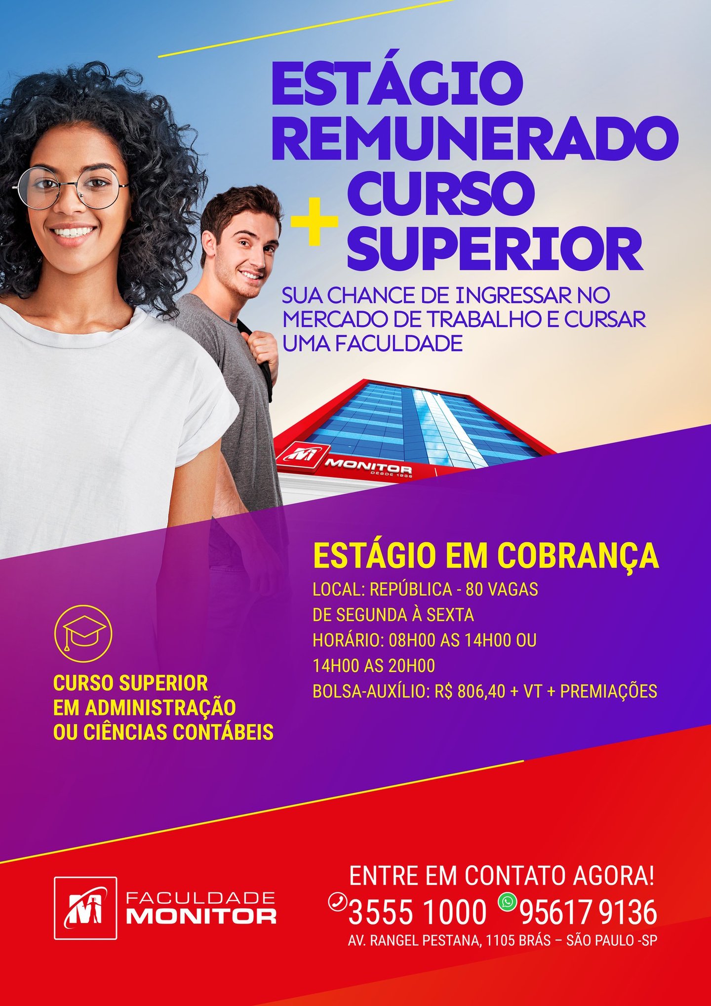 These were the challenges when we launched Monitor College in 2018. With only unimpressive courses (Business Administration and Accounting), with daytime and evening classes, the mission was nearly impossible. So, we had to, first and foremost, build on the 80-year tradition of the Monitor Institute. But that alone wasn't enough to convince the target audience. So, we needed to find a positioning that wouldn't pit the brand against a competitive edge. This opportunity lay in targeting the mid-market, where there were increasingly fewer competitors. To achieve this, we set a tuition rate appropriate for this segment and created a campaign that would become a benchmark in the following years: College + Employment. Through telemarketing companies, students had the opportunity to pay for their studies with the salary they received from job opportunities offered by the College itself.