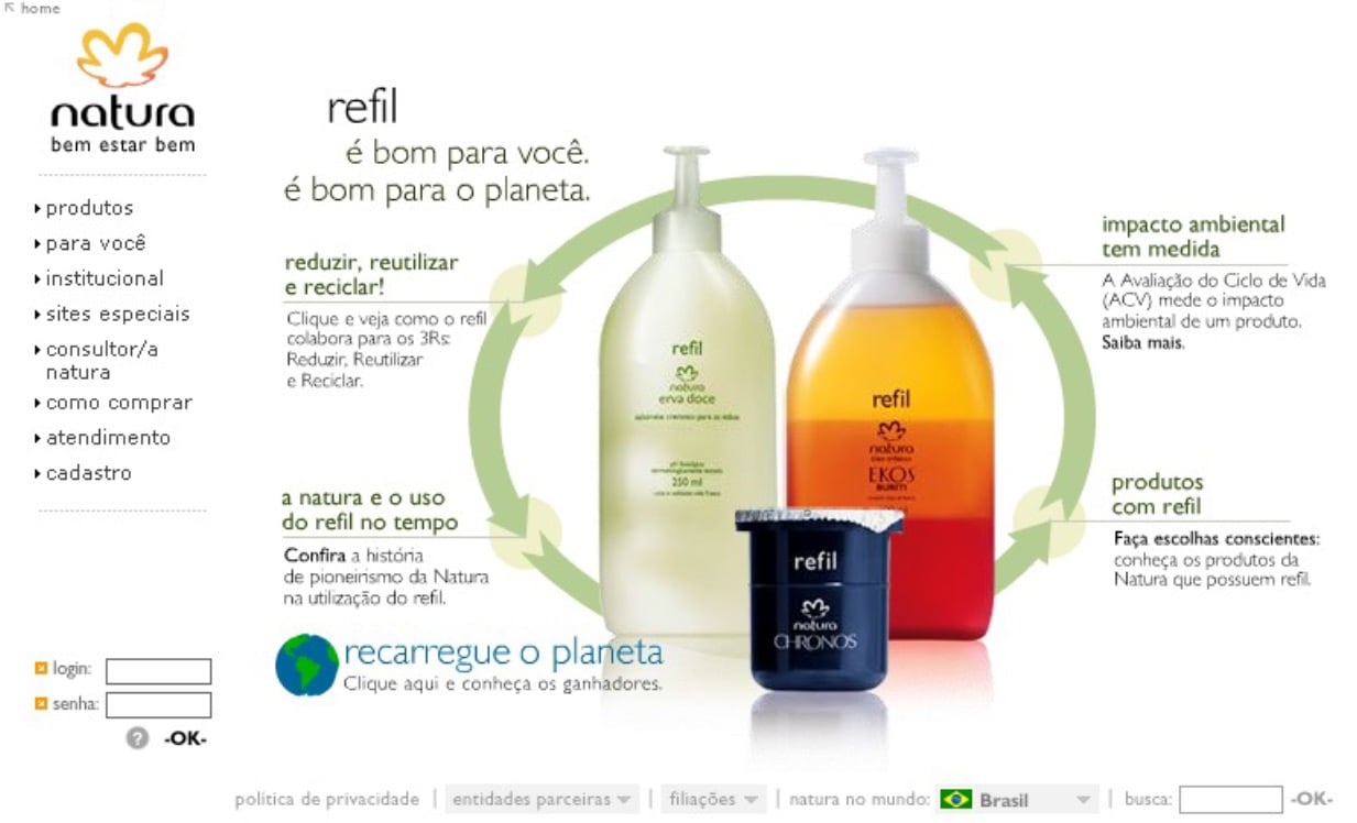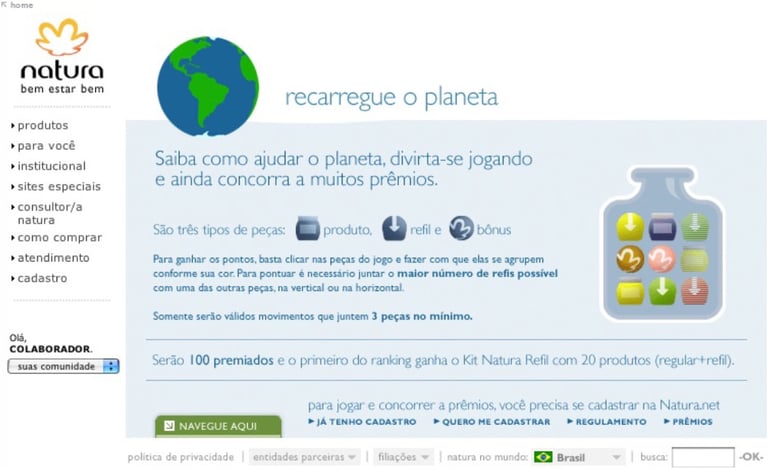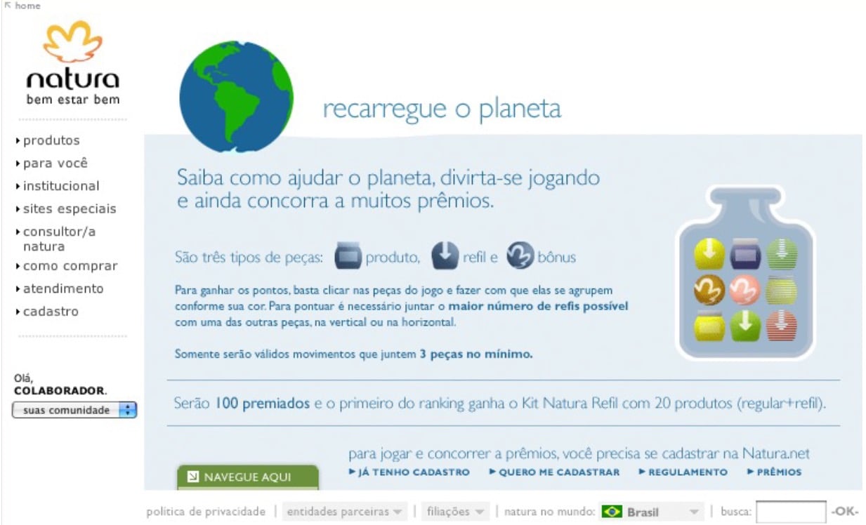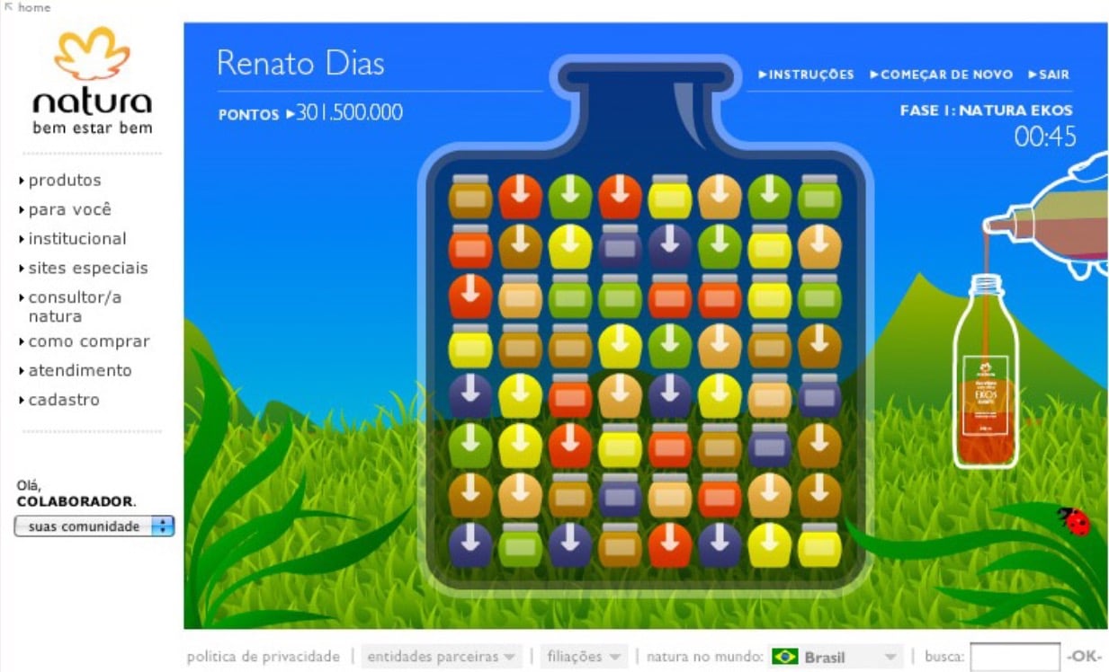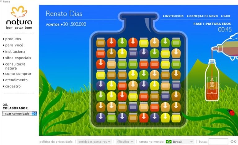 Natura, as a pioneer in sustainability, wanted to encourage the use of refills among its audience, especially younger audiences. We created a desktop game (cell phones weren't even smartphones at the time) that worked similarly to Caixa de Jóias, a very successful game at the time. The objective was simple: the more refills selected per full pack, the more products were eliminated, and the faster the game's landscape (initially a barren field) would recover vegetation.